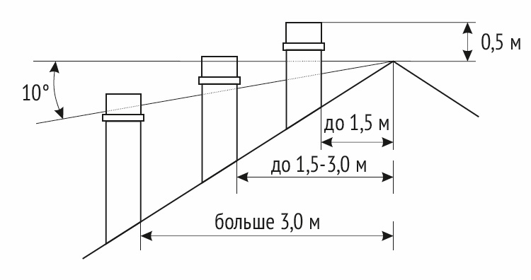 – не менее 500 мм – над коньком кровли или парапетом при расположении трубы на расстоянии до 1,5 м от конька или парапета;